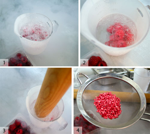 將樹(shù)莓分開(kāi)。1)在液氮中放入一些覆盆子(確保足夠)。2)等待劇烈的沸騰停止-現(xiàn)在漿果一直被冷凍。您可以根據(jù)需要減少凍結(jié),但是硬凍結(jié)使您的工作時(shí)間更長(zhǎng)。3)用a面杖搗碎漿果。4)應(yīng)變。