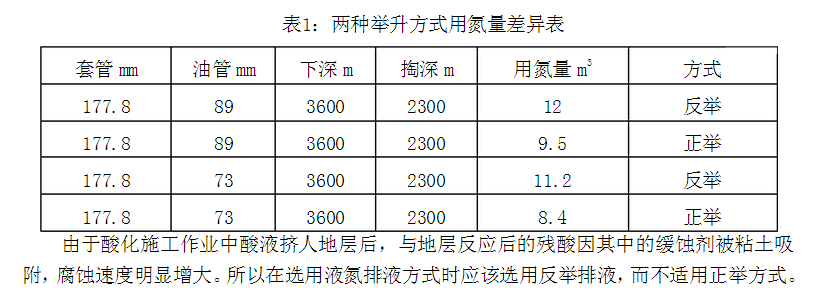 在預(yù)定的排液深度較深時,正舉排液用液氮量要少于反舉排液時的用液氮量,但是在預(yù)定的排液深度較淺時,反舉排液用液氮量就要小于正舉排液的用氮量了(見表1)。